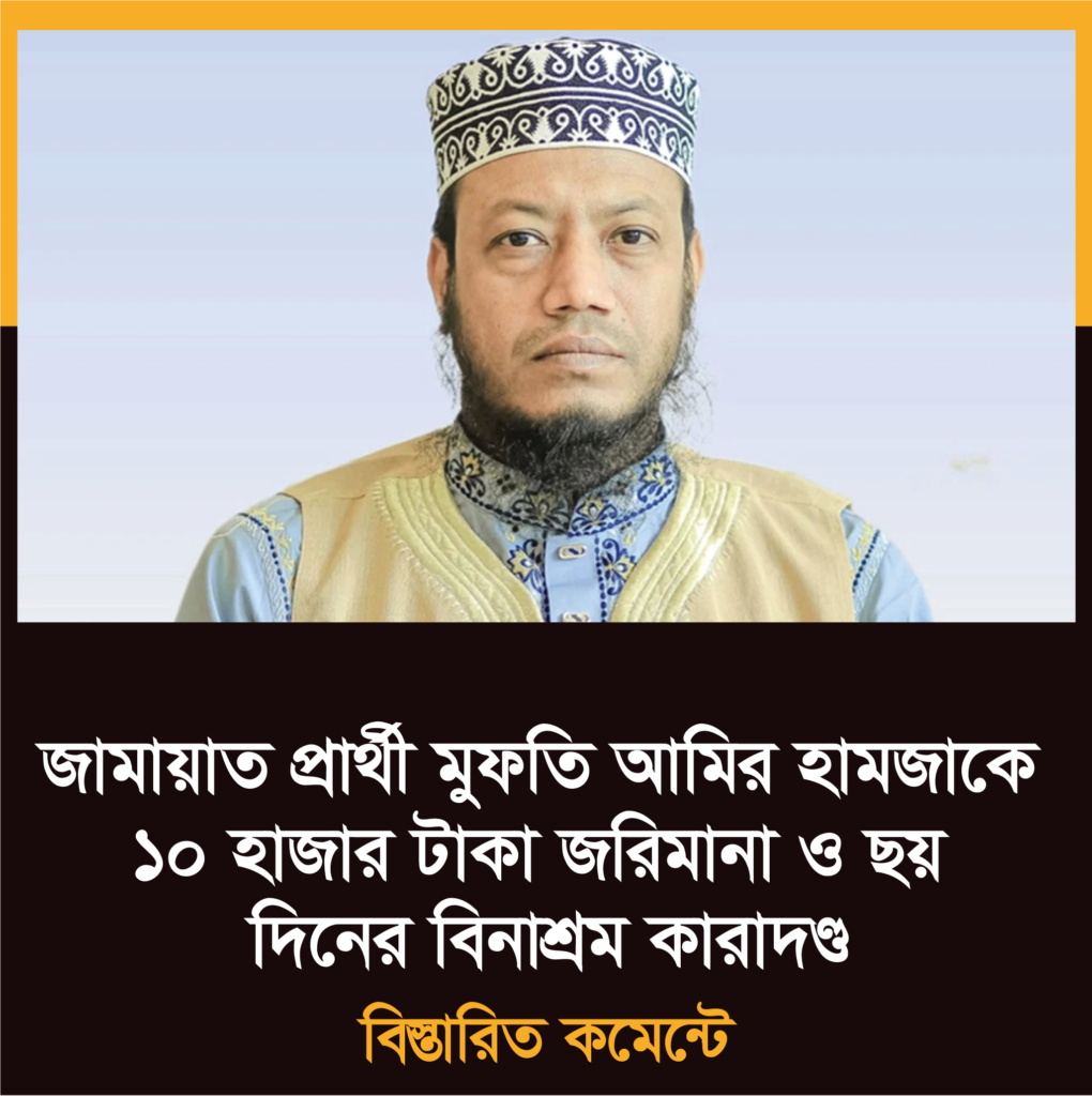 এবার আচরণবিধি ভঙ্গের দুটি অভিযোগে কুষ্টিয়া–৩ (সদর) আসনে জামায়াত ইসলামী মনোনীত সংসদ সদস্য প্রার্থী আমির হামজাকে ১০ টাকা জরিমানা, অনাদায়ে