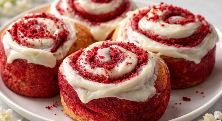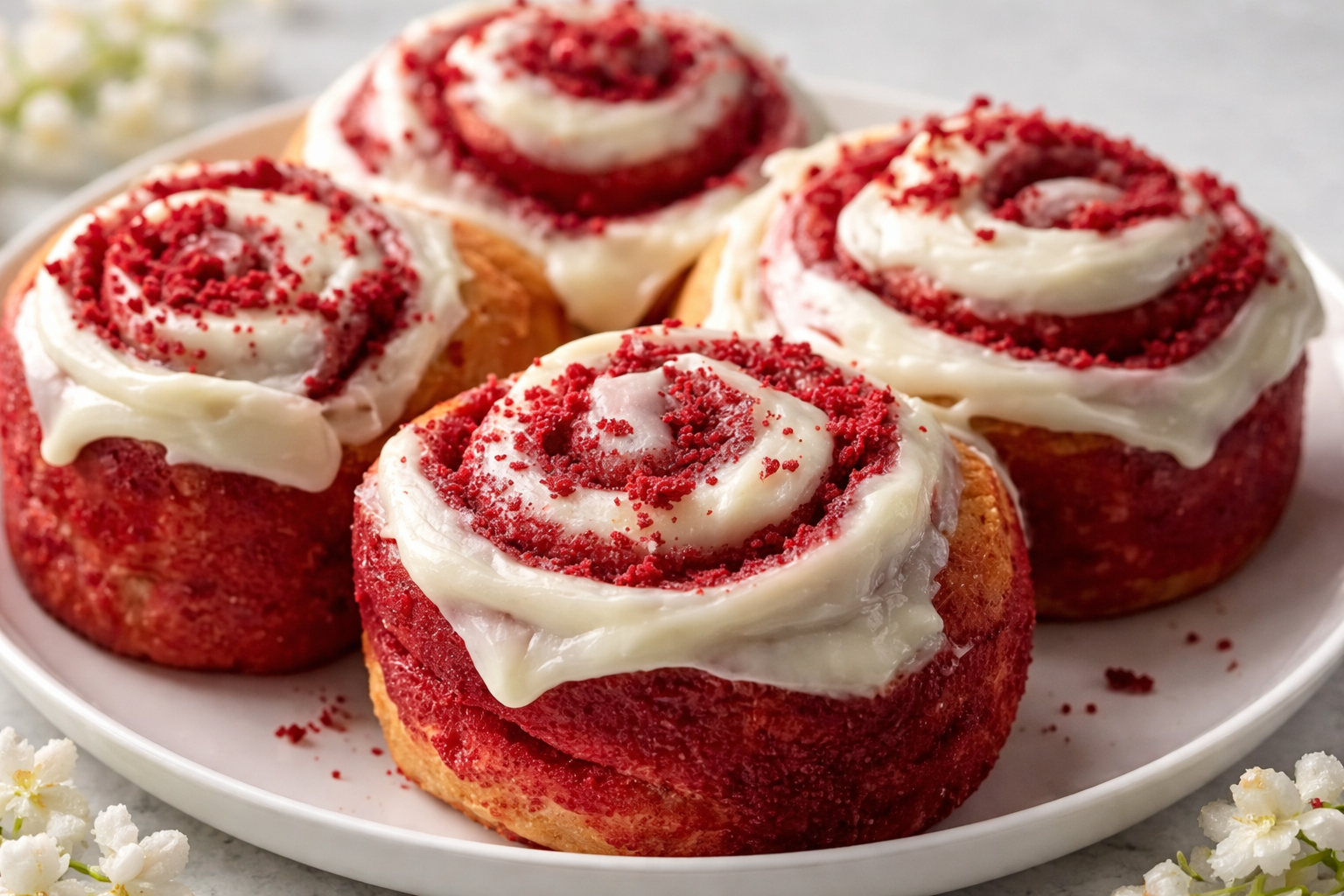 Soft, fluffy red velvet rolls swirled with a rich cinnamon filling and topped with silky cream cheese glaze. Buttery, slightly chocolatey, and beautifully vibrant — perfect for holidays, brunch, or special occasions.