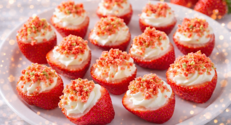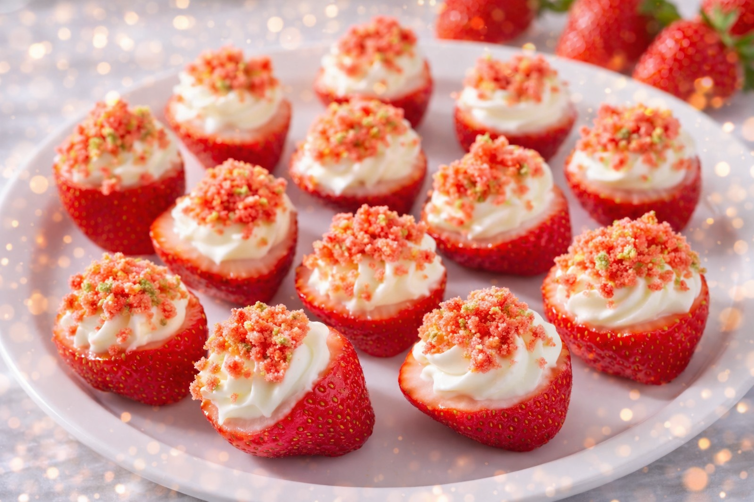6. Sprinkle the prepared strawberry crunch topping evenly over the filled strawberries.