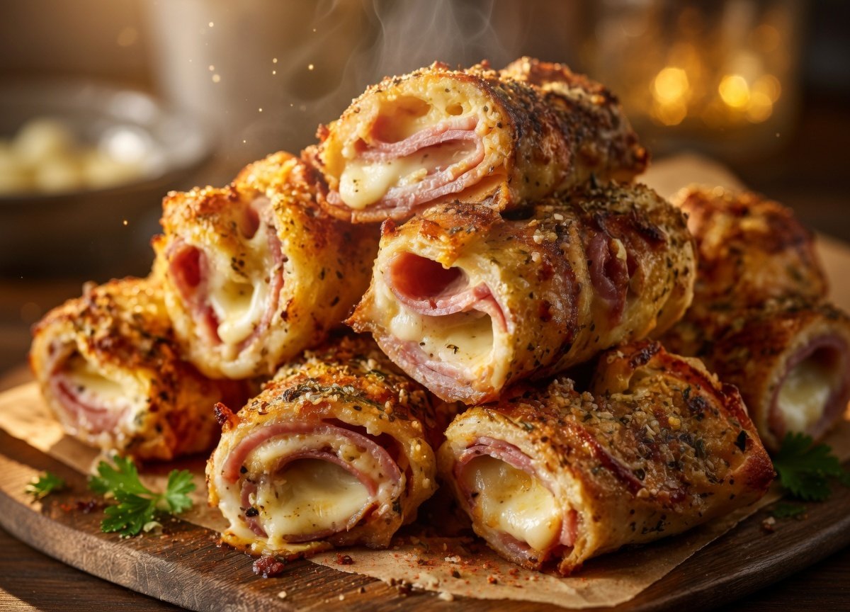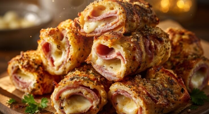 Crispy, golden cheese-wrapped ham rolls oozing with melty goodness — perfect for snacks or party bites!