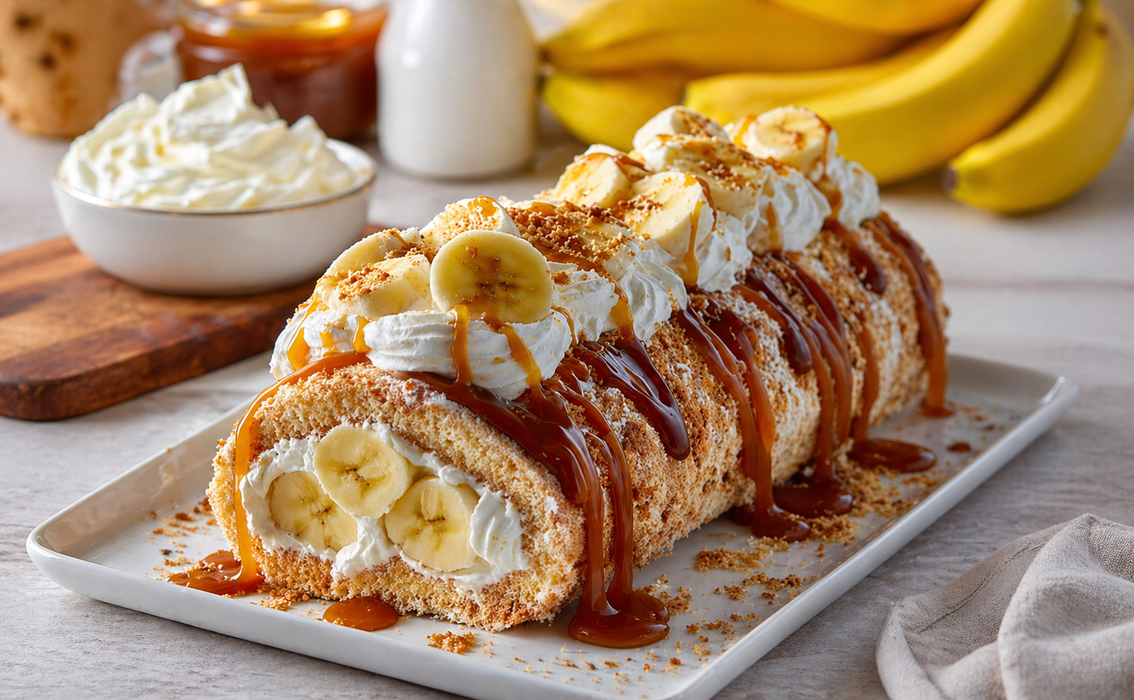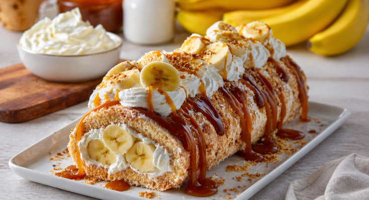 A soft sponge cake rolled with fresh bananas, fluffy cream, and drizzled with rich caramel sauce—pure indulgence in every slice! 😍