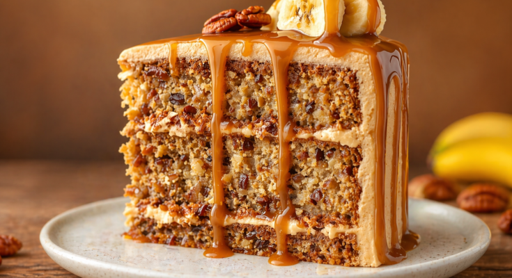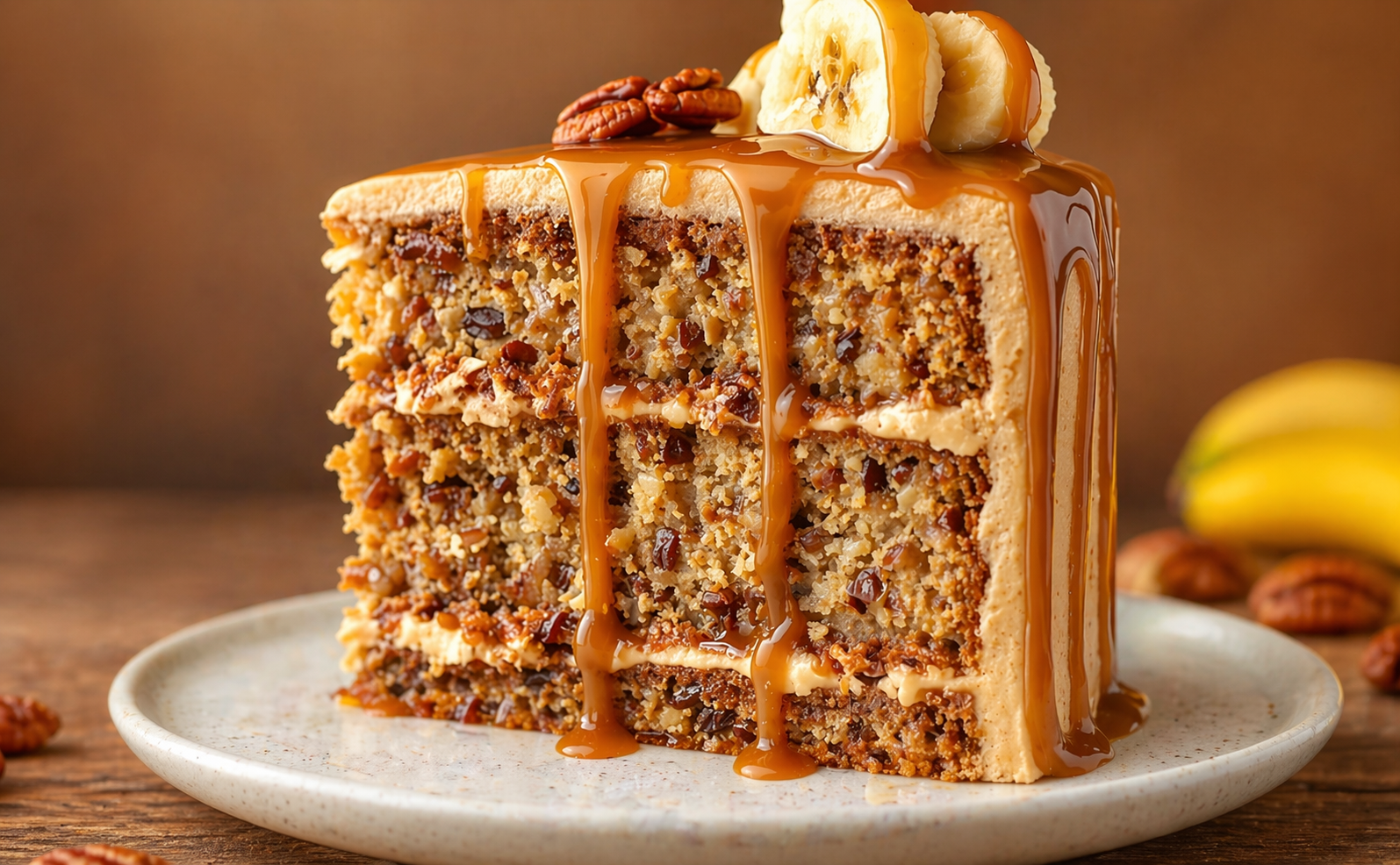 Moist banana cake loaded with pecans, stacked high with caramel frosting and dripping with golden caramel sauce! Pure indulgence in every bite 😍