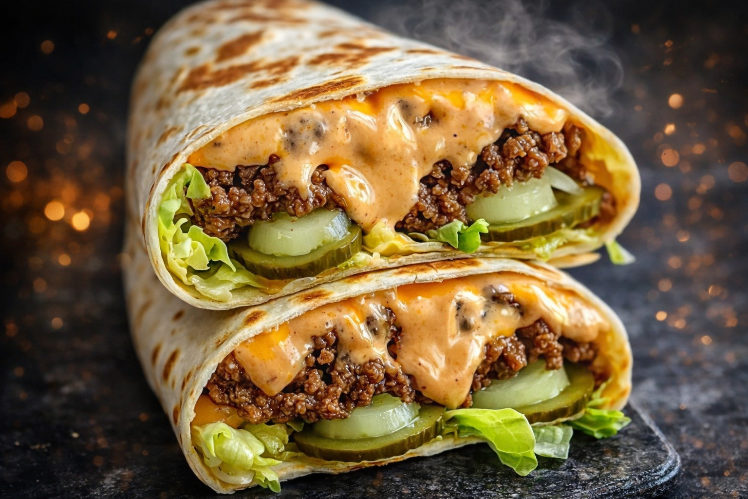 Classic Big Mac flavors wrapped up! Ground beef, homemade special sauce, lettuce, cheese, and pickles in a tortilla.