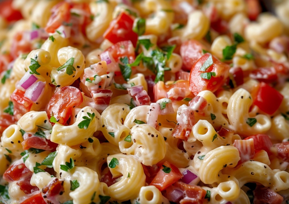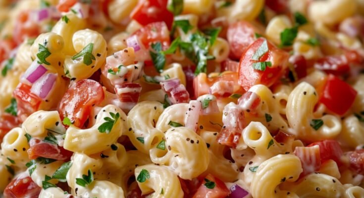 BLT Macaroni Salad is a creamy, crowd-pleasing twist on the classic bacon, lettuce, and tomato sandwich. It combines tender elbow macaroni with crispy bacon, juicy cherry tomatoes, and fresh lettuce, all tossed in a tangy, flavorful dressing. Perfect for picnics, potlucks, barbecues, or simple family dinners, this chilled pasta salad delivers bold flavor and satisfying texture in every bite.