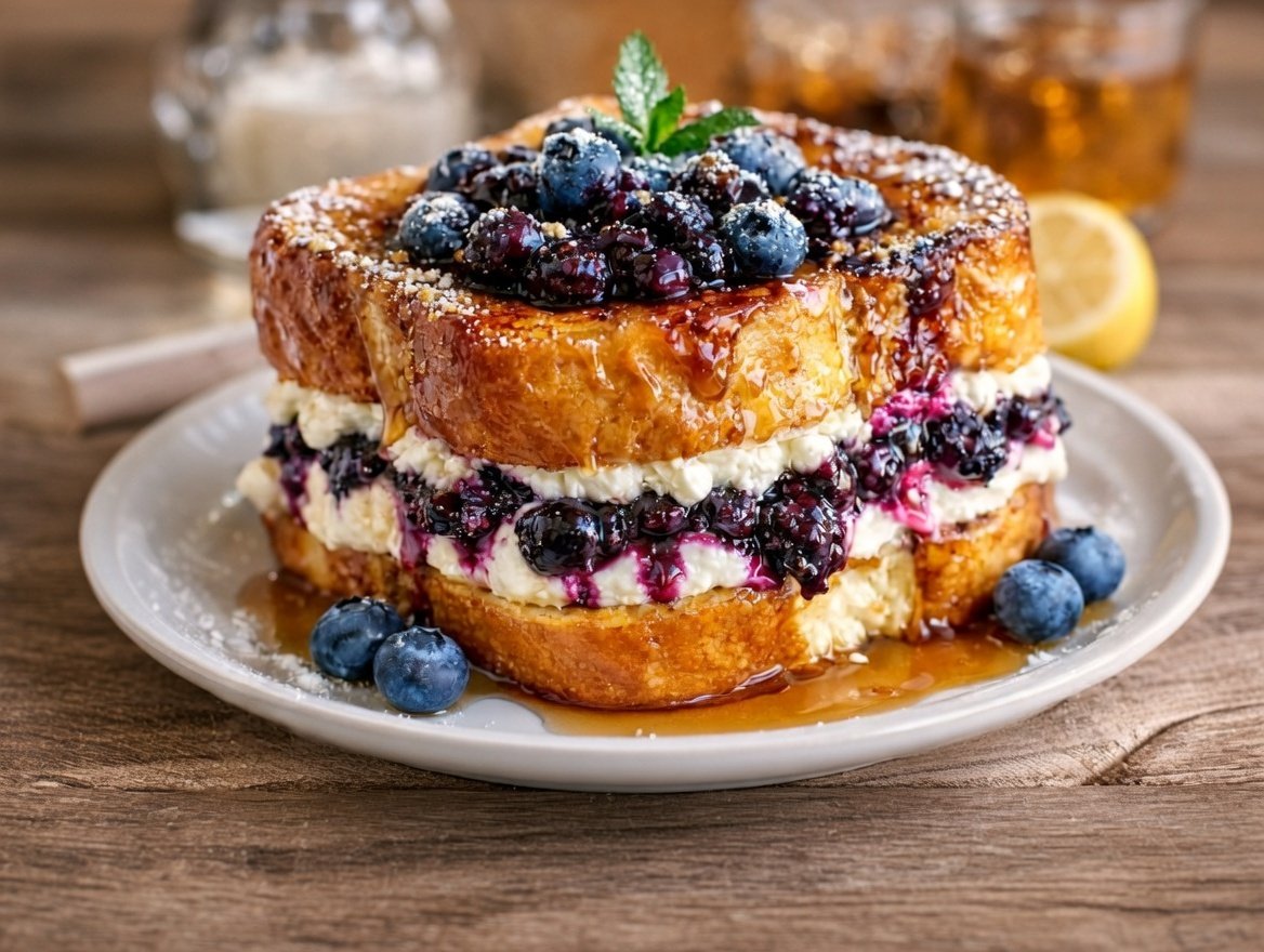This isn’t your average French toast. The center is filled with a silky smooth mixture of cream cheese, vanilla, and powdered sugar, giving it a luscious cheesecake-like texture. The fresh blueberries tucked into the filling burst with flavor, creating the perfect balance between sweet and tangy.