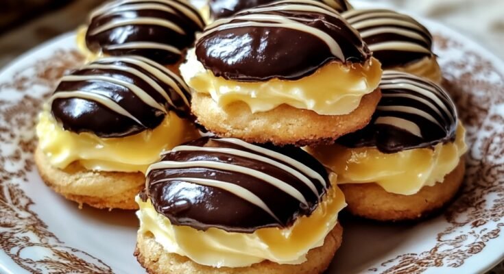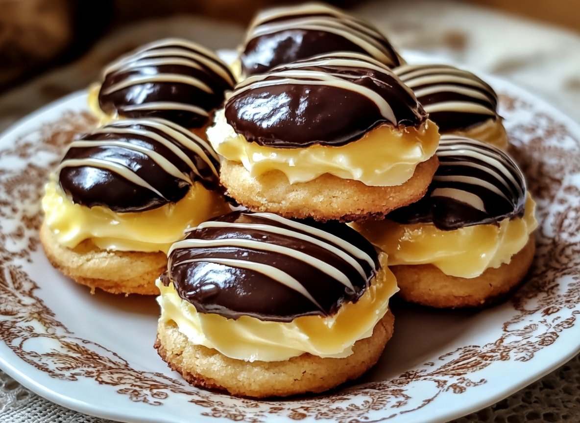 Pipe a generous amount of vanilla cream into the well of each cooled cookie cup, filling it slightly above the rim.