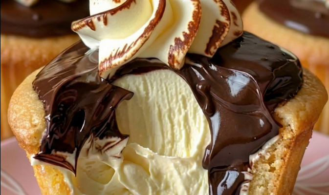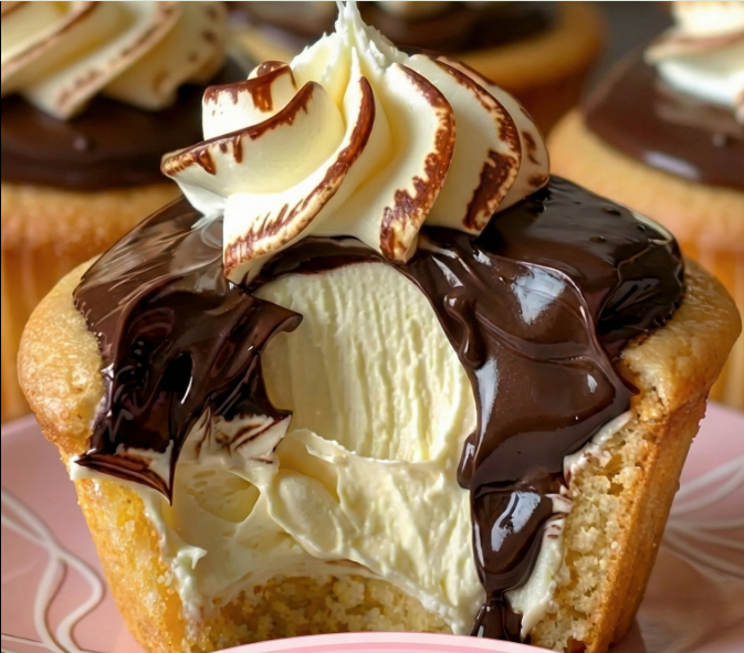 Boston Cream Pie Cupcakes creamy vanilla and topped with rich chocolate