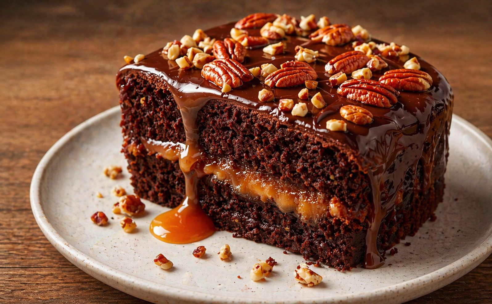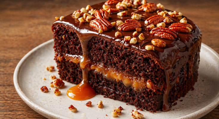 8. Let cool completely, then top with chocolate ganache and extra pecans for a luscious finish!