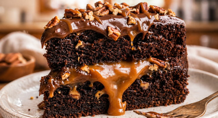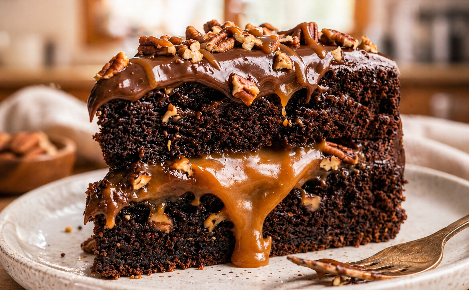 A rich, gooey chocolate cake loaded with caramel, pecans, and melty chocolate goodness!