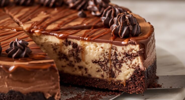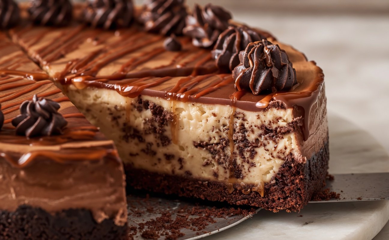 A rich, fudgy brownie base topped with silky caramel cheesecake and swirled with luscious chocolate—pure dessert heaven!