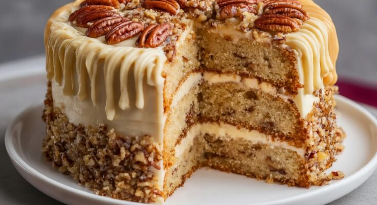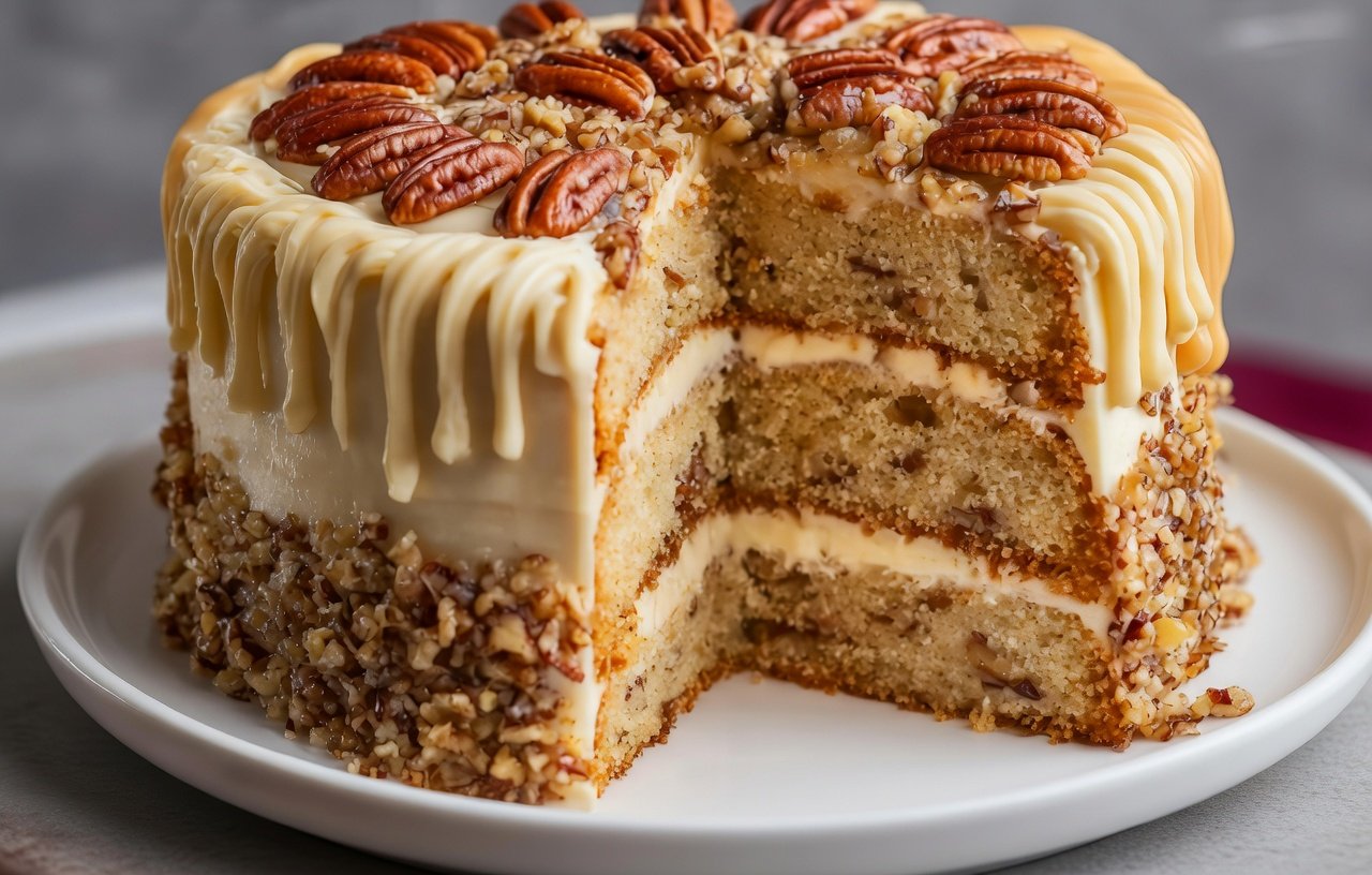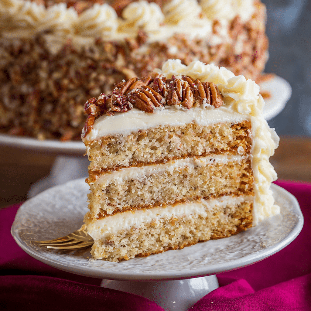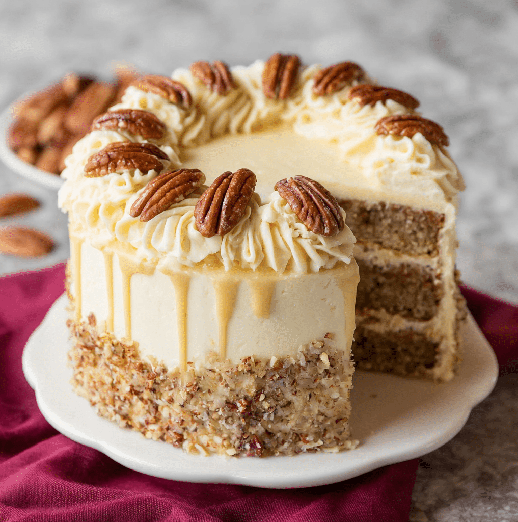 - Assemble the Cake: If needed, level the cakes. Stack the cake layers with icing between each layer and frost the outside. Optionally, decorate with additional chopped pecans and piped frosting swirls for a beautiful finish.