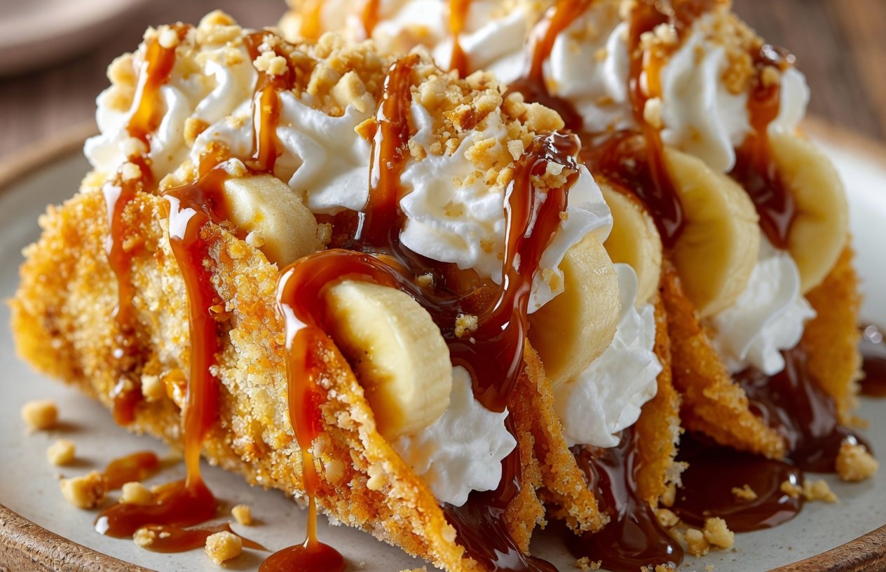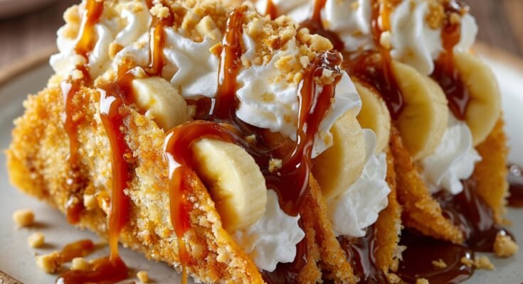 Sweet, crunchy taco shells filled with creamy goodness, bananas, and rich caramel drizzle 🤤🥜