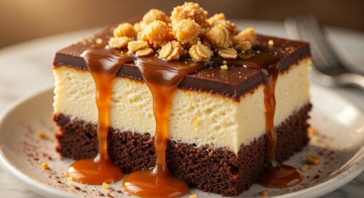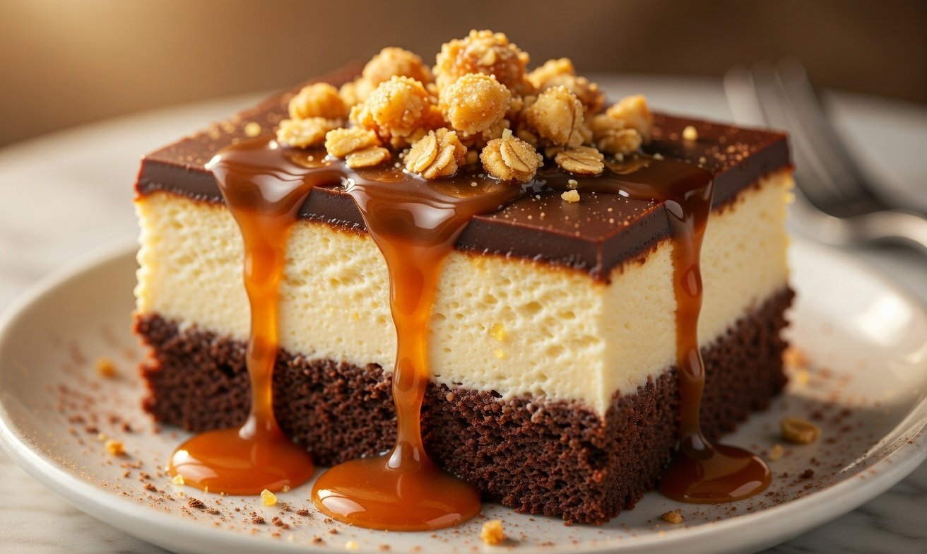 A rich and indulgent dessert with fudgy brownies, creamy cheesecake, and silky caramel drizzle!