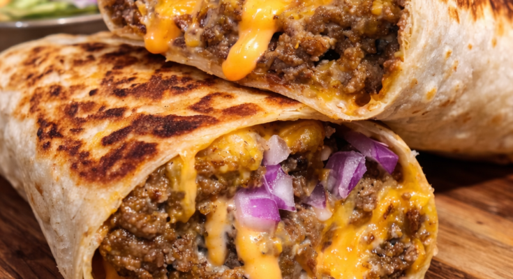 Juicy ground beef, crispy fries, zesty sauce, and cheese wrapped in a golden tortilla for a hearty meal.