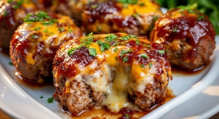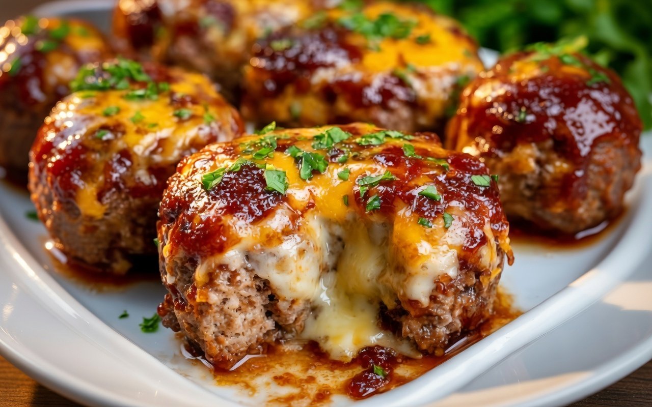 Mini meatloaf bites baked with gooey cheese centers. Perfect for appetizers or family dinners.
