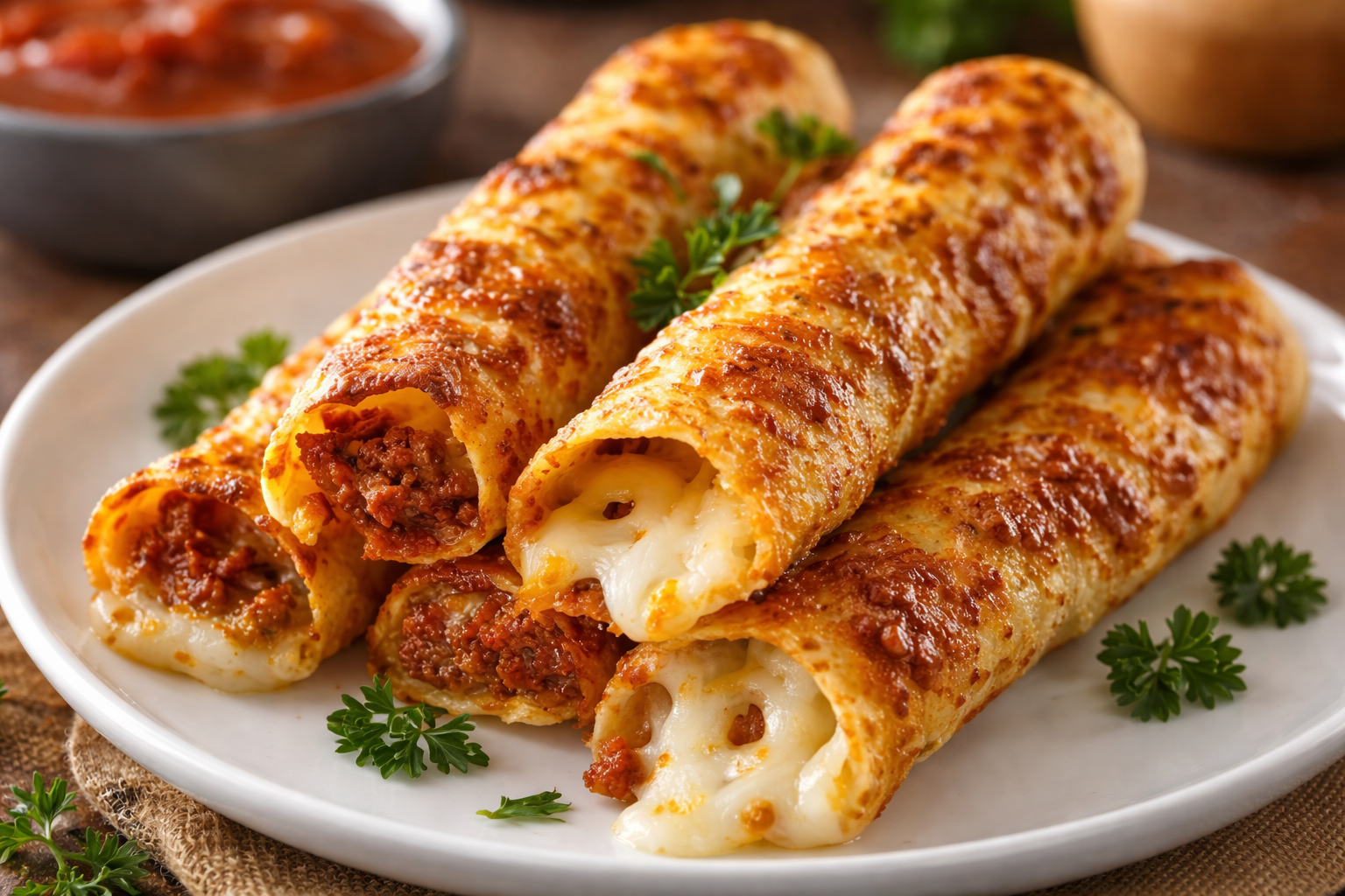 These irresistible handheld treats combine the bold flavors of taco night with the comfort of cheesy, golden-baked bread in perfect bite-sized portions. Seasoned ground beef and gooey cheese sticks get wrapped in pizza dough, brushed with garlic butter, and baked until crispy on the outside and melted on the inside. Each stick delivers that satisfying cheese pull and savory taco taste that makes them impossible to resist, whether you’re serving them as party appetizers, game day snacks, or a fun family dinner that gets everyone excited.