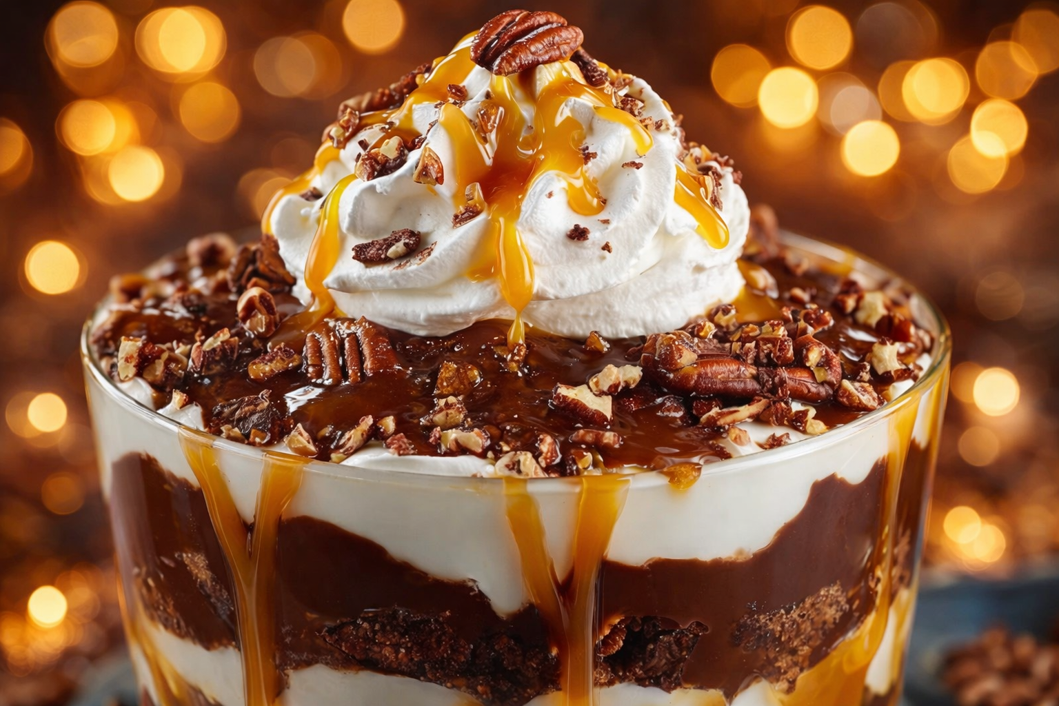 A delicious layered dessert featuring chocolate pudding, whipped cream, caramel sauce, and chocolate cake, topped with chocolate chips and pecans.