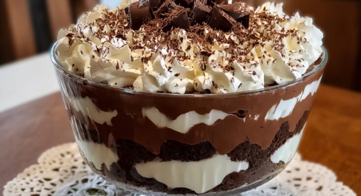 This Chocolate Cheesecake Trifle delivers everything people love about rich, layered desserts — deep chocolate flavor, creamy cheesecake filling, soft cake layers, and a luxurious texture in every spoonful. Traditionally, some versions include a cream liqueur for flavor, but this recipe recreates that signature smooth, chocolate-vanilla taste using completely alcohol-free ingredients, making it suitable for all ages while still feeling elegant and special.