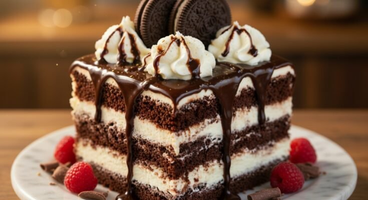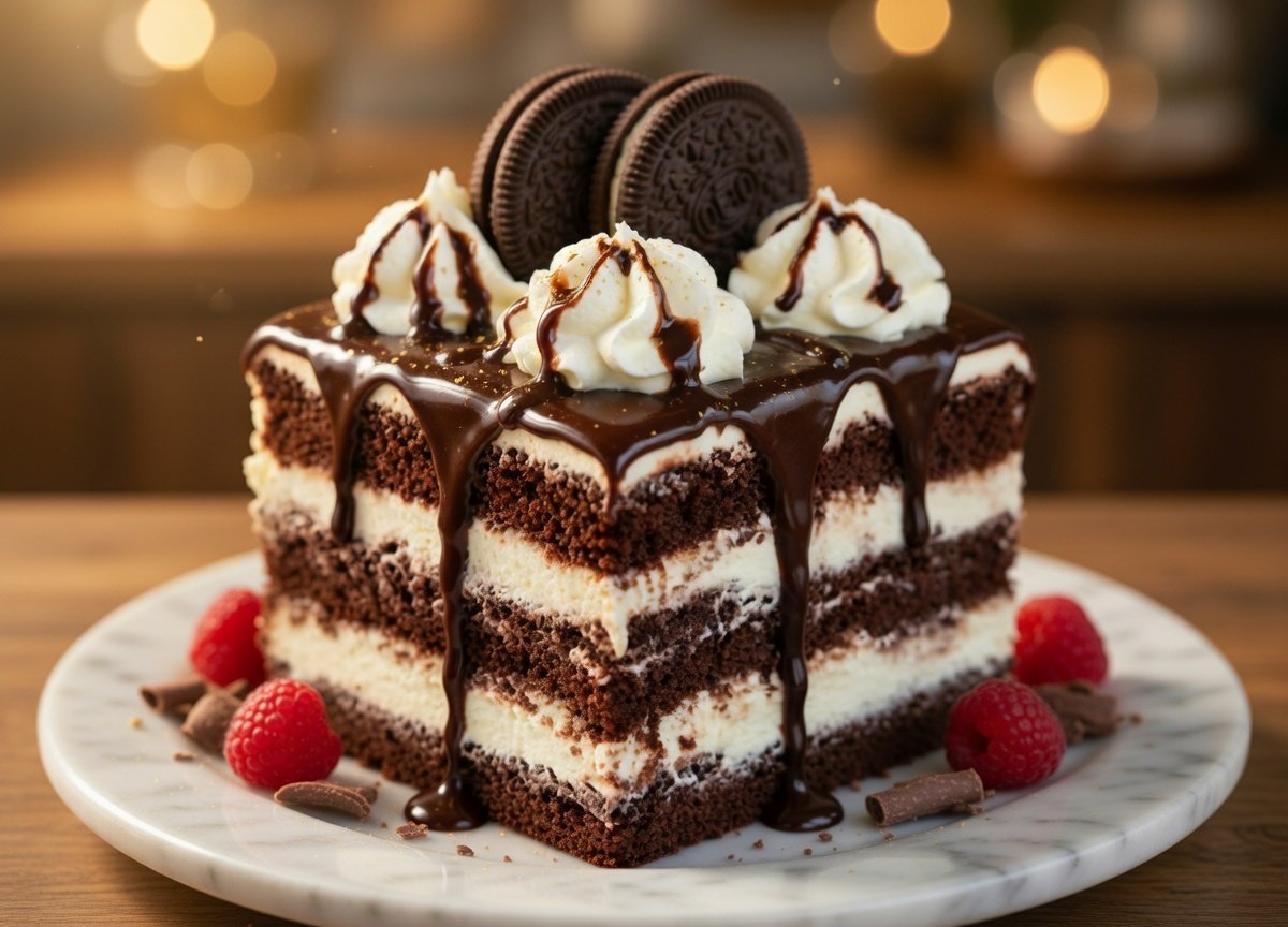 Rich chocolate layers with creamy filling and a glossy, gooey fudge drip.