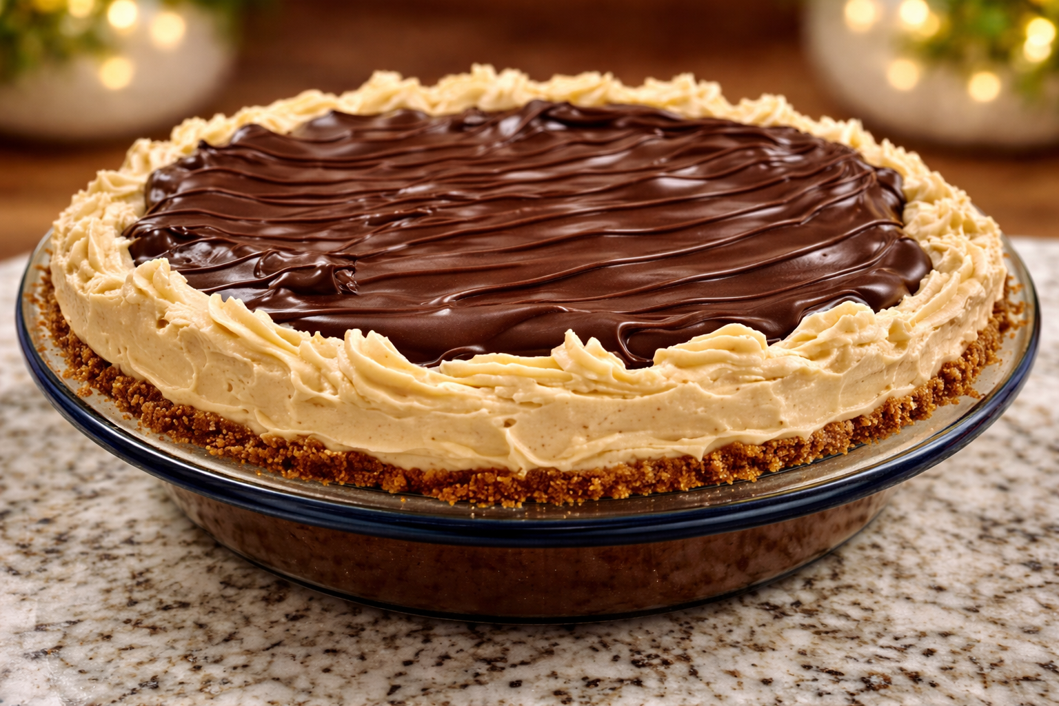 Pour the silky ganache over the peanut butter filling, tilting the pie to ensure an even coating. Chill until set.