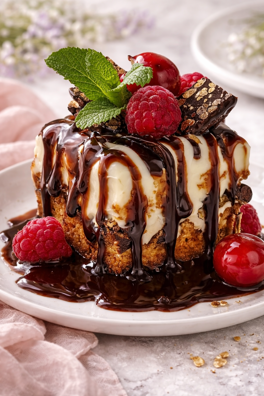 - Drizzle melted white chocolate on top, add chocolate chunks if desired, and top with raspberries and cherries. Garnish with fresh mint and spoon extra chocolate sauce around the slice for a dramatic look.