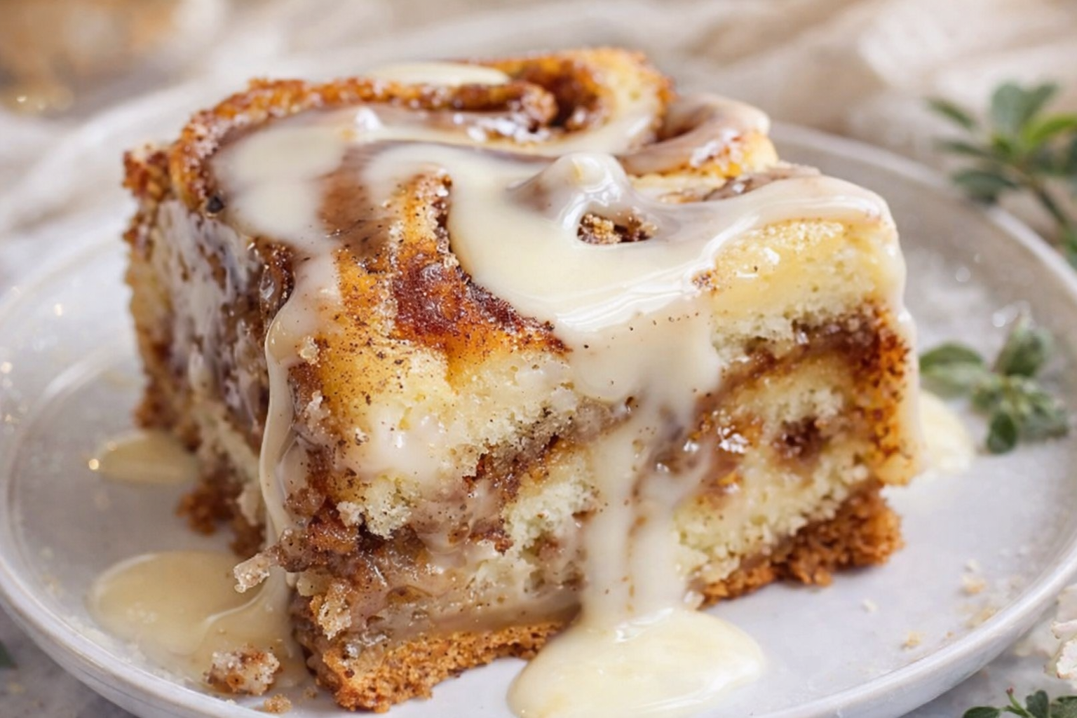 Cinnamon-spiced cake with buttery swirls and sweet glaze.