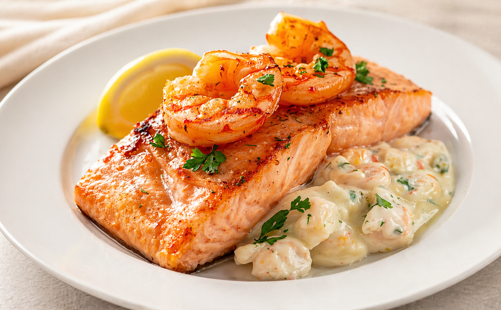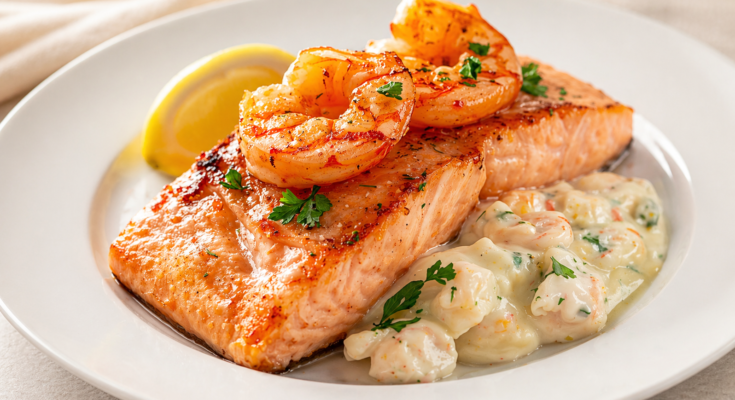 A rich, buttery salmon fillet stuffed with creamy seafood goodness—perfect for an elegant dinner! 😋✨