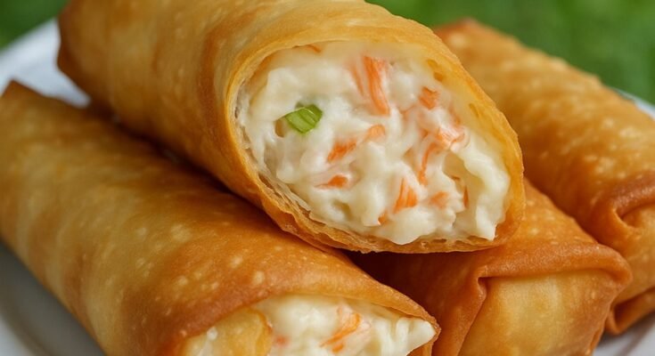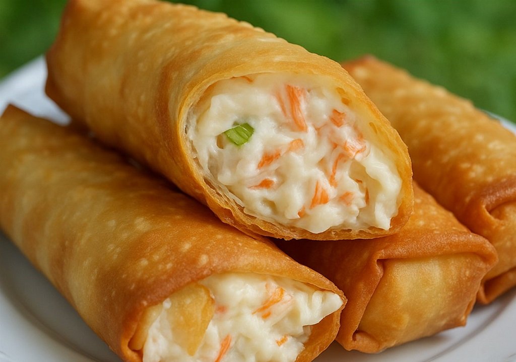 Creamy crab rangoon filling wrapped in crispy golden egg roll wrappers
