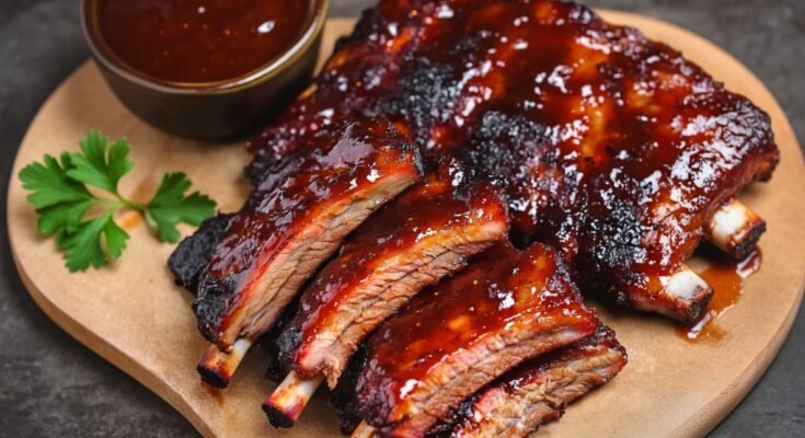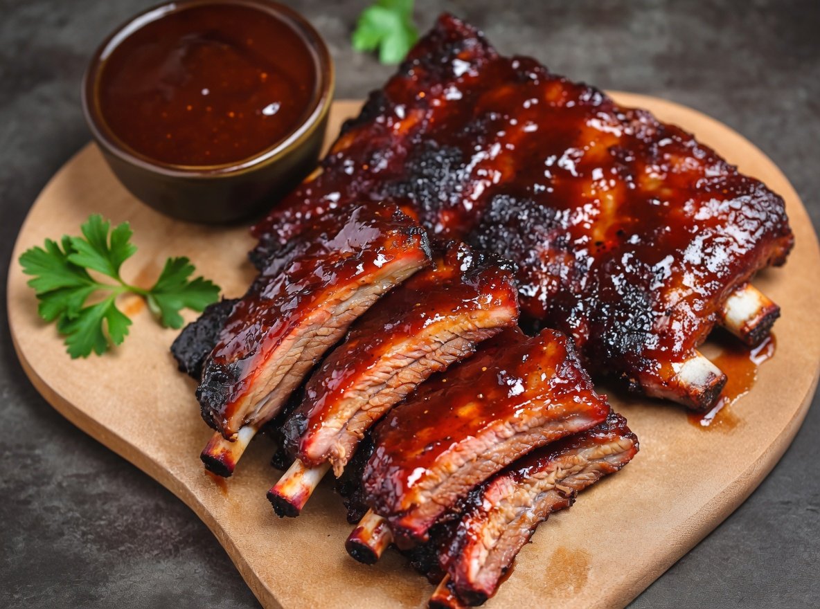 Transfer it to the oven and broil it for 5 minutes on high heat. If you prefer you can place the ribs onto a preheated barbecue grill and grill for 5 minutes. This step allows the barbecue sauce to set onto the ribs. Remove the ribs from the oven and let them set for 5 to 10 minutes or until they are not too hot to handle. After they are cooled add some more barbecue sauce to serve just brush the ribs with the sauce using a pastry brush.