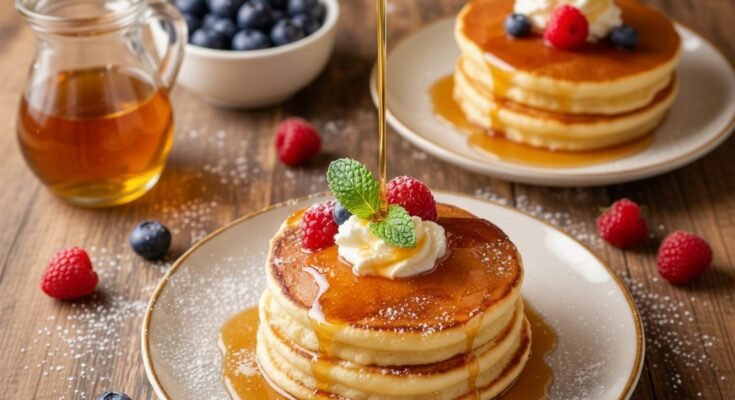 Flip the pancake to the other side to cook for about 45 seconds, then place it on a plate. Serve the pancakes immediately with some blueberries on the sides and top with honey or syrup.