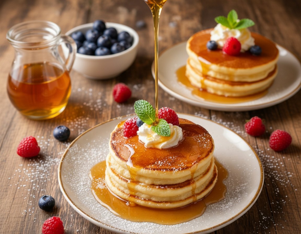 - Stack the pancakes on a plate and serve up with some fresh blueberries, banana slices and a good drizzle of honey.