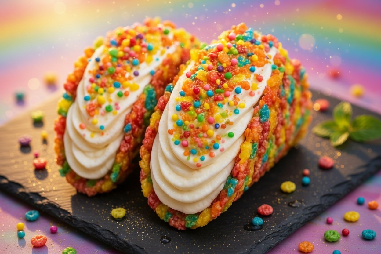 These whimsical dessert tacos transform childhood breakfast memories into an unforgettable treat that brings pure joy to any gathering. Crunchy, colorful cereal shells cradle smooth, vanilla-scented cheesecake filling that melts perfectly on your tongue, while extra cereal pieces add delightful pops of fruity flavor and satisfying texture. The playful presentation makes everyone smile before they even take their first bite, proving that sometimes the most creative desserts come from combining unexpected ingredients in surprising ways.