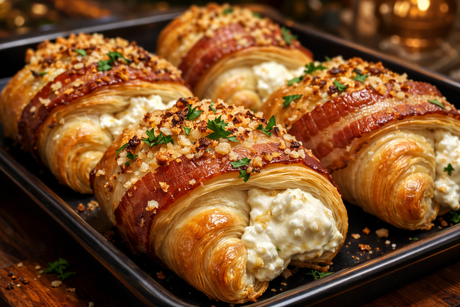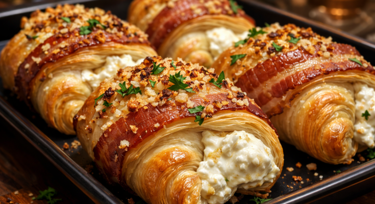 Chicken and bacon crescents filled with creamy cheese, garlic, and herbs, baked until perfectly golden.