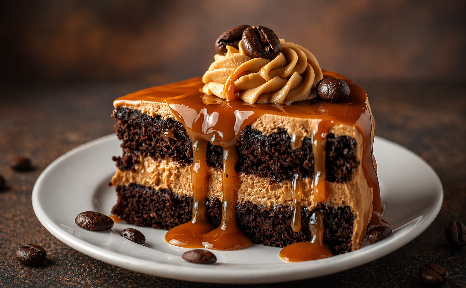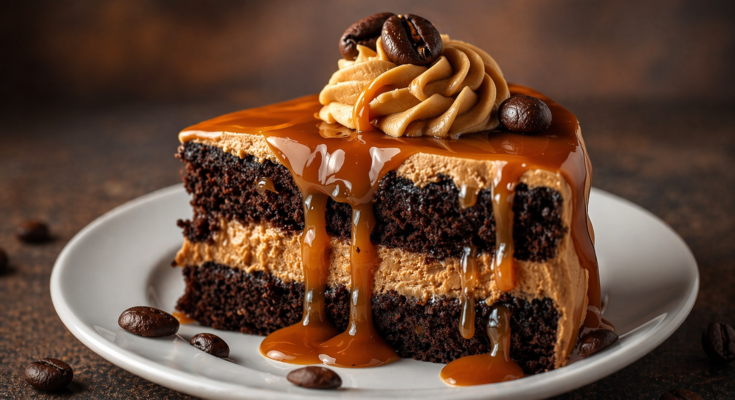 A rich, moist coffee-infused cake layered with creamy caramel frosting and topped with a luscious caramel drizzle and roasted coffee beans—perfect for coffee lovers! 😍🔥