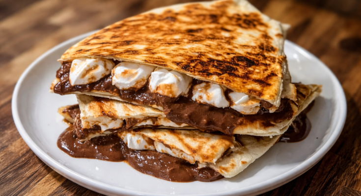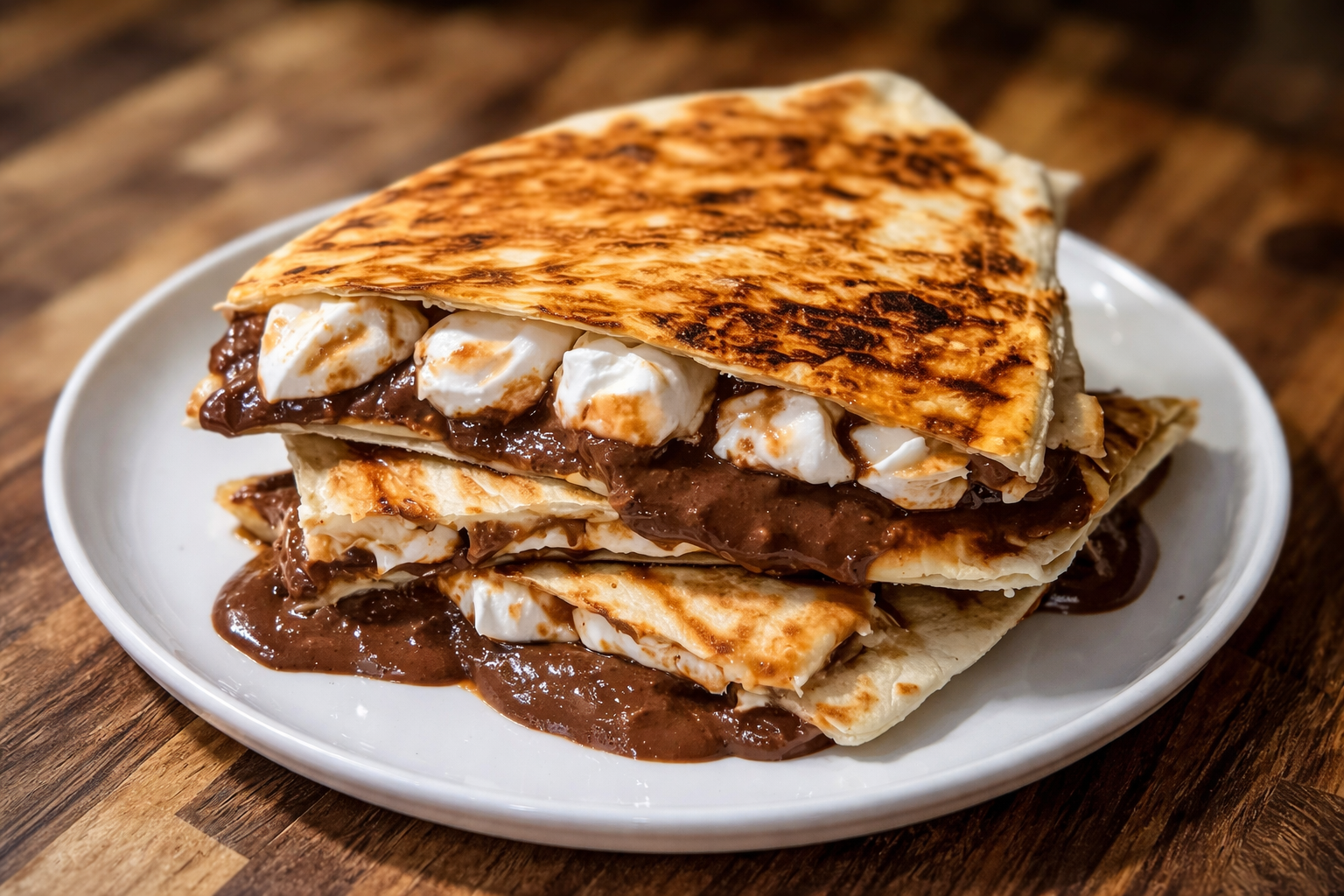 Place the coated quesadillas on the hot surface. Cook for 2–3 minutes per side, until the exterior is golden brown, caramelized, and crispy, and the marshmallows have melted inside. Use a spatula to press down gently while cooking to ensure even browning.
