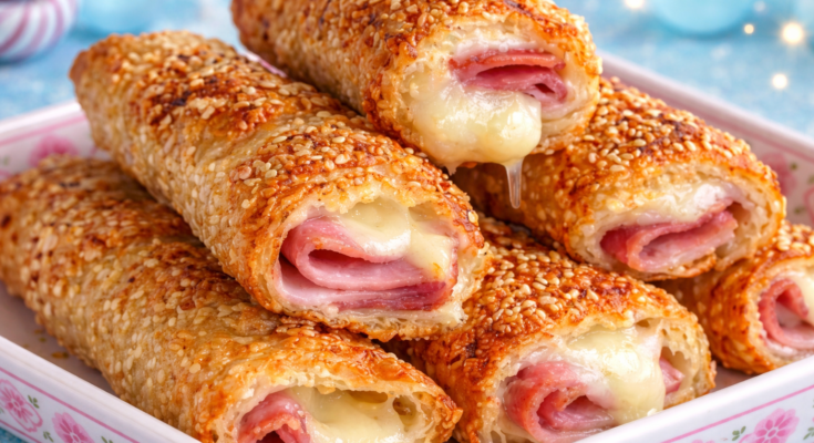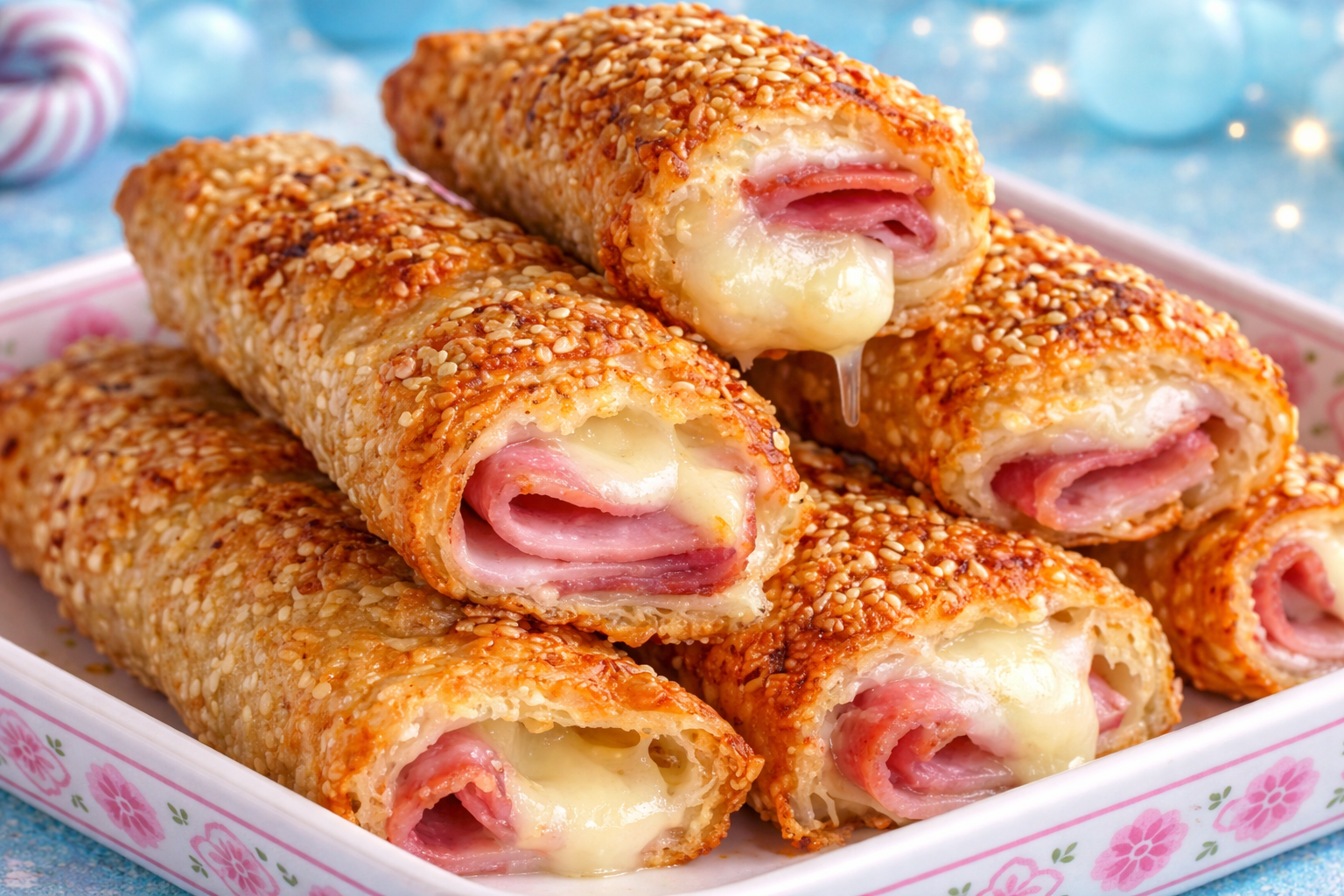 2: Assemble: Unroll dough, spread a little mustard if using, add ham, top with a cheese stick, roll tightly, and seal edges well.