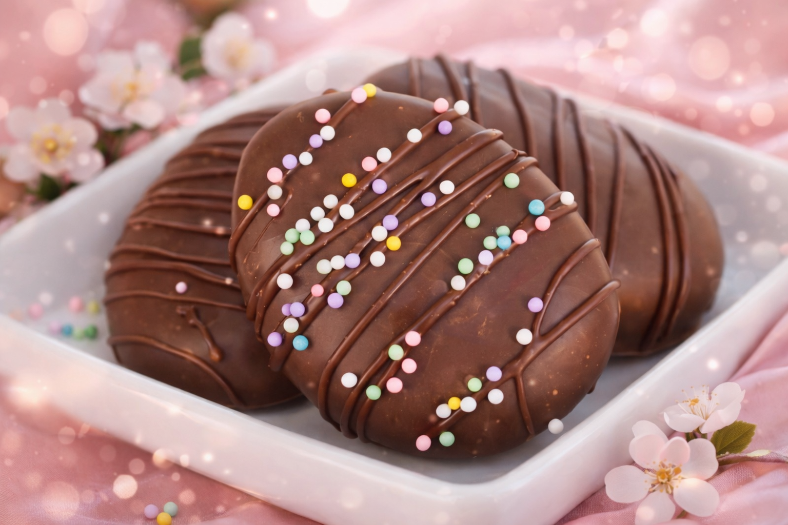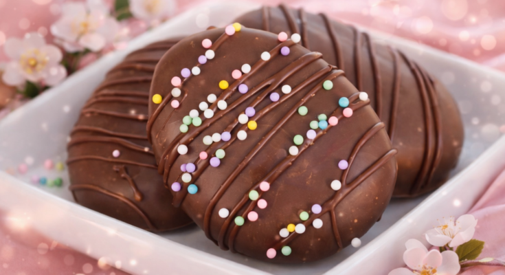 6: Using a fork, dip each peanut butter egg into the melted chocolate, flip to coat completely, lift it out, let the excess drip off, and return to the lined tray; sprinkle with flaky sea salt or decorations if desired.