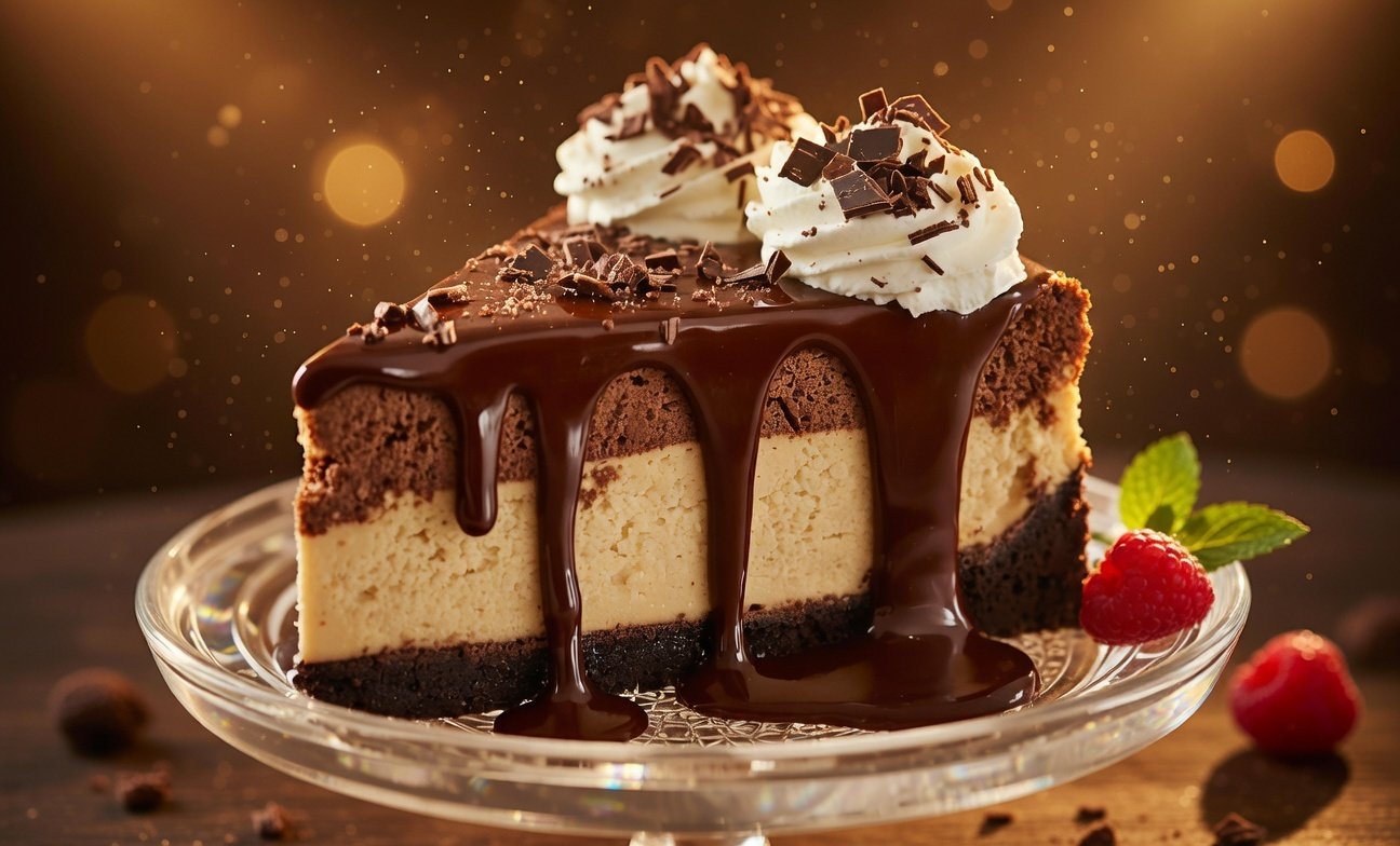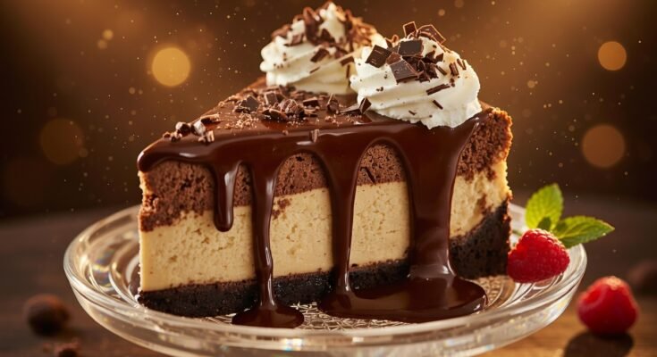 A rich, creamy cheesecake loaded with chocolate and topped with warm, gooey hot fudge and whipped cream — pure dessert heaven!