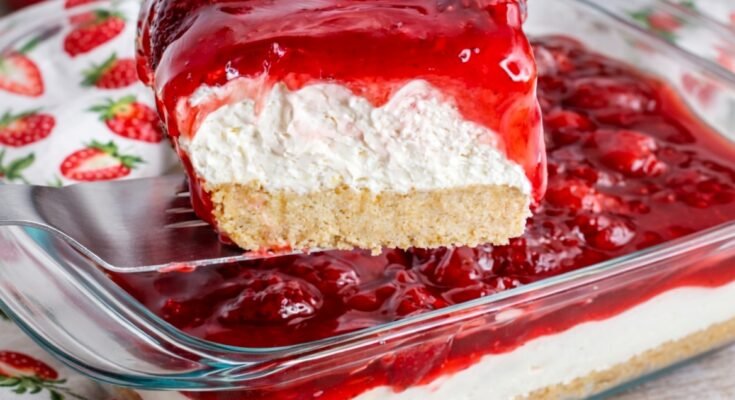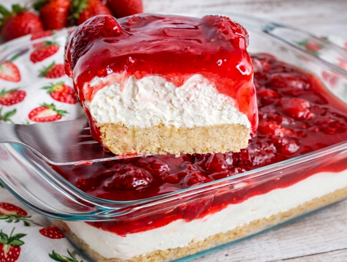 No Bake Strawberry Cheesecake Delight is the ultimate no-bake dessert for the spring and summer months. A buttery graham cracker crust topped with a super thick and creamy layer of a cheesecake mixture and topped with strawberry pie filling. Strawberry Cheesecake Delight: A No-Bake Classic That Never Goes Out of Style If you grew up anywhere that values a good potluck, chances are you’ve had some version of this dessert. Strawberry Delight has been around for generations, and it’s not hard to see why. It’s easy to throw together, uses simple ingredients, and hits all the right notes—creamy, fruity, sweet, and just a little nostalgic.