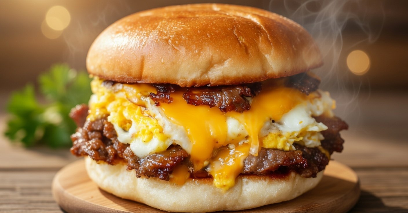 A homemade version of McDonald’s popular breakfast sandwich featuring buttery onions, steak, scrambled eggs, American cheese, and tangy sauce—all layered on toasted bagels for an easy, family-style breakfast treat.