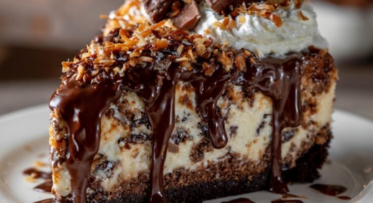 6. In a separate bowl, mix coconut, pecans, and caramel sauce. Spoon this mixture over the cheesecake.