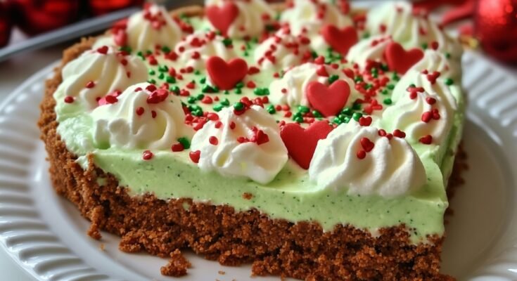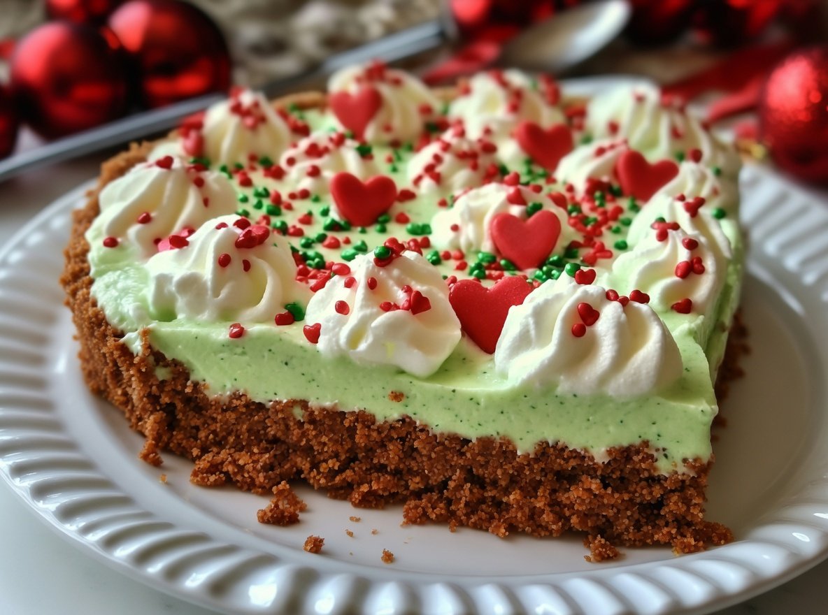 This festive Grinch Pie is a bright green no bake dessert that brings instant holiday cheer and a big dose of fun to any winter gathering. With a creamy pudding filling and playful heart sprinkles, it is the perfect make ahead treat for December parties or movie nights.