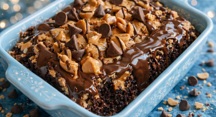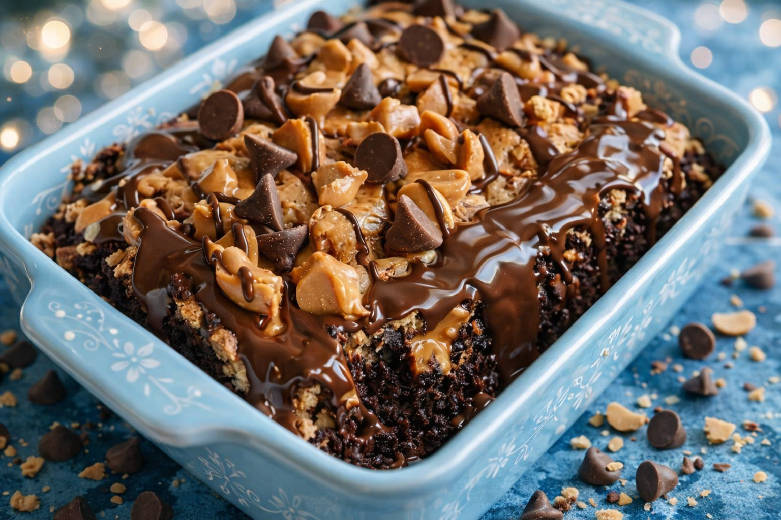 6: Scatter chopped peanut butter cups and mini chocolate chips evenly over everything.