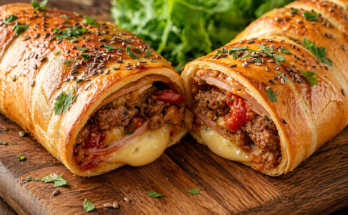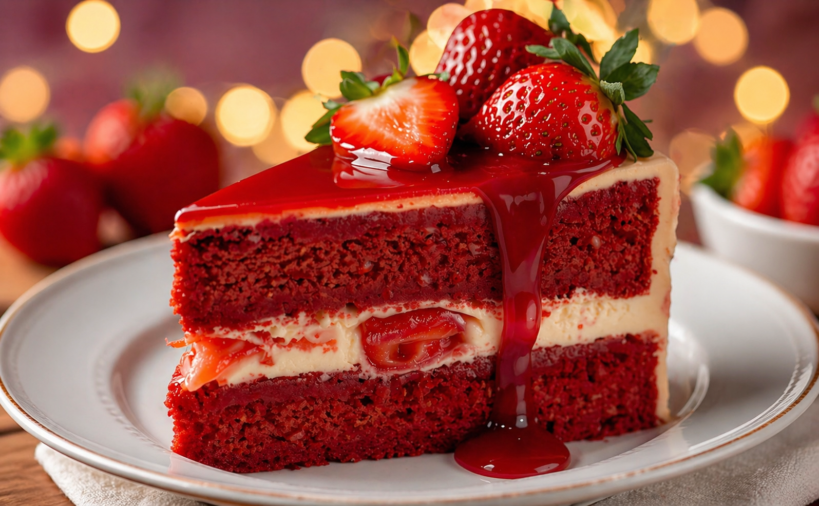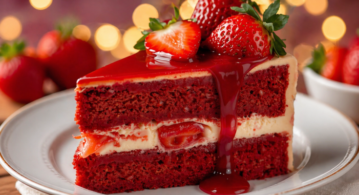 A luscious, show-stopping dessert with layers of moist red velvet cake, creamy cheesecake, and juicy strawberries! 🍓🔥