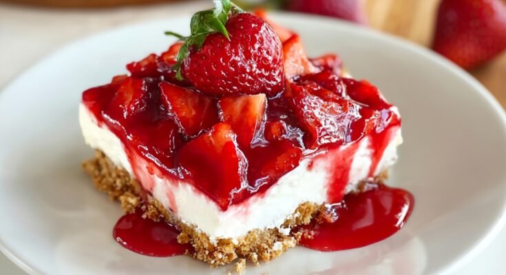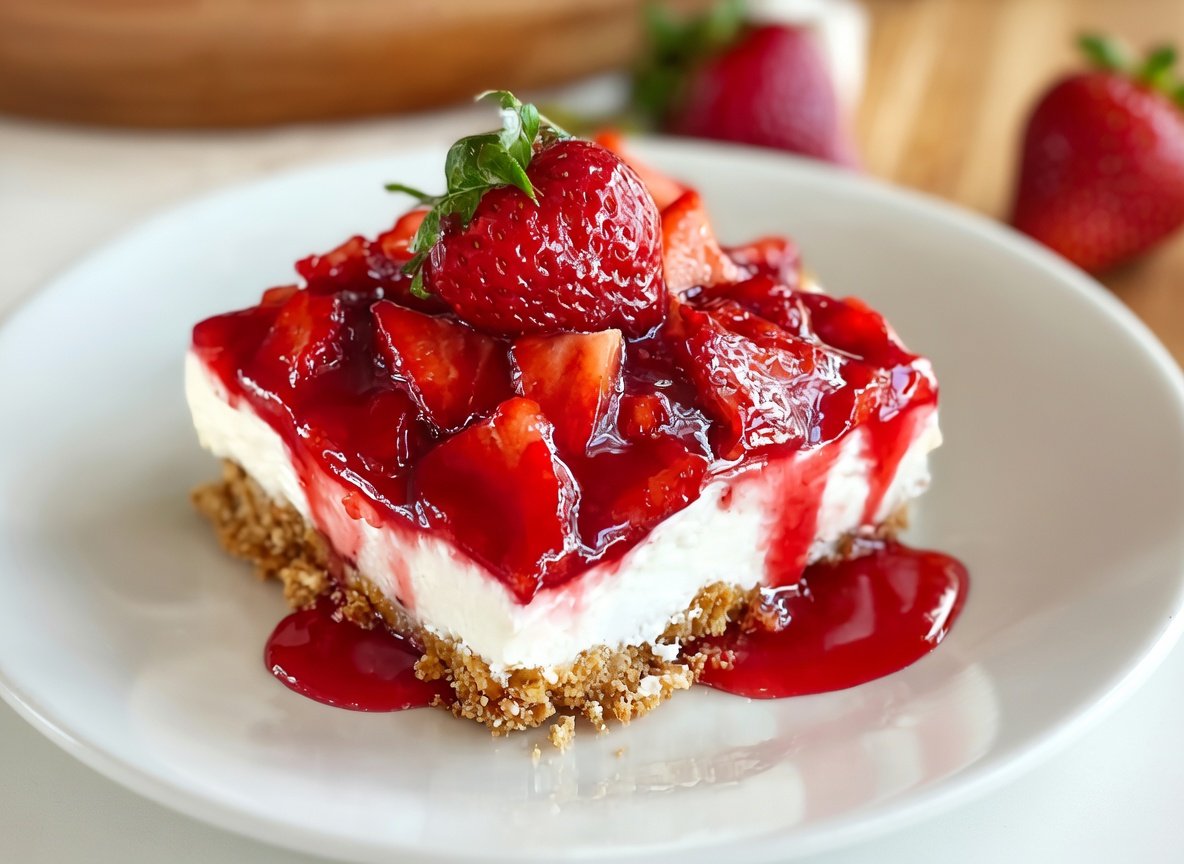 Once set, slice into squares or rectangles and serve chilled. Each bite delivers a burst of strawberry sweetness, creamy richness, and that signature salty pretzel crunch.
