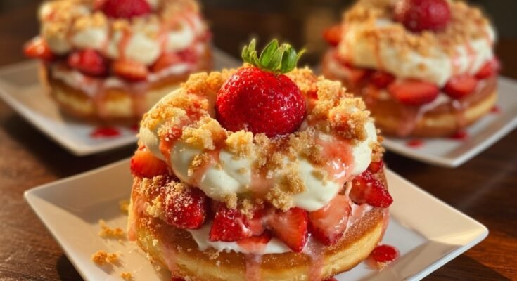 Top the Stack: Spread another layer of the cheesecake topping over the top donut. Sprinkle the prepared buttery crumble generously over the topping. Scatter the diced fresh strawberries over the crumble.
