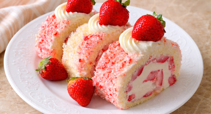 6: Assemble: Unroll cake carefully, spread cheesecake filling leaving a small border, sprinkle strawberries, roll back up snugly, wrap, and chill at least 1 hour.